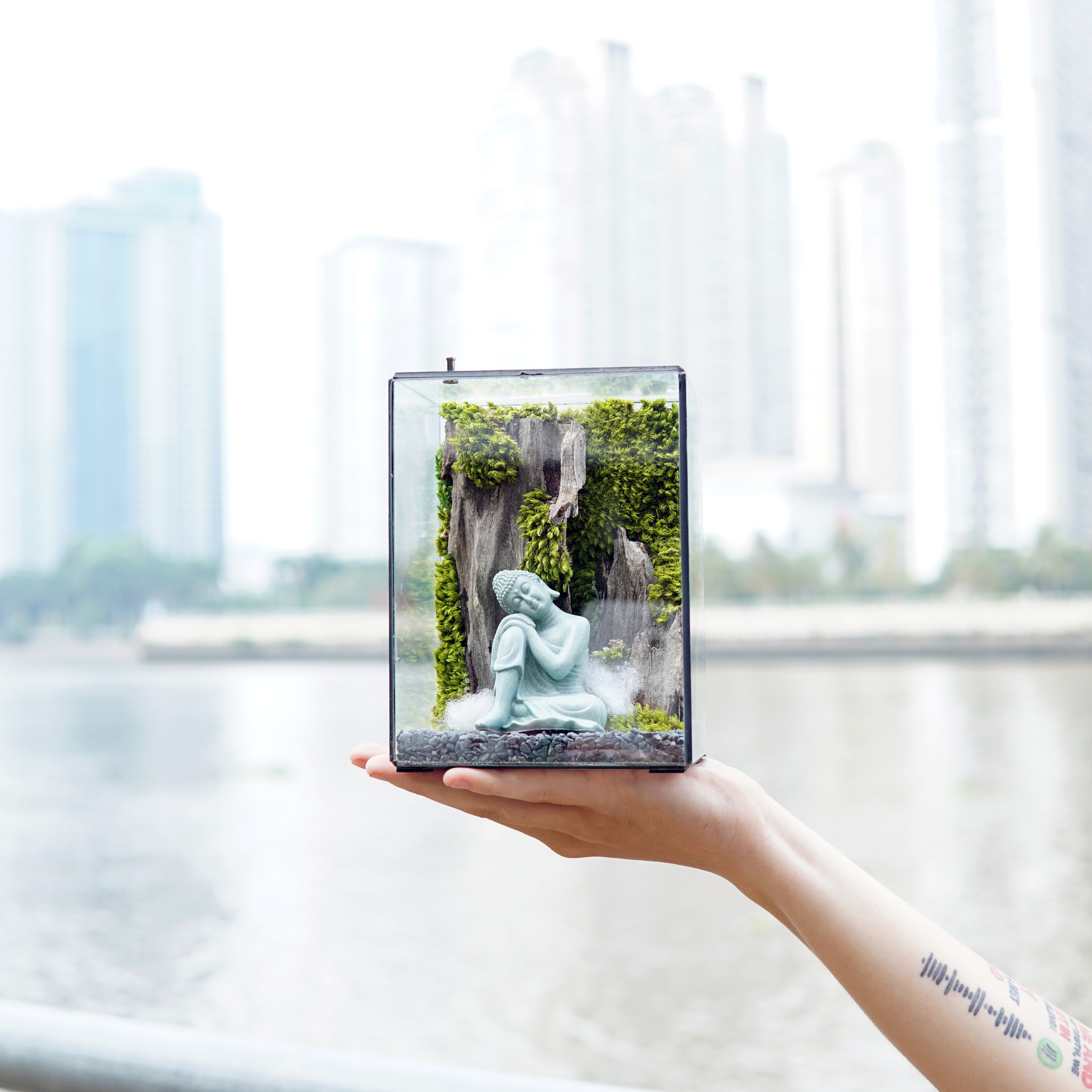 Tiểu cảnh "An Nhiên" là một tác phẩm nghệ thuật terrarium được thiết kế để mang lại sự thư thái và tĩnh lặng tuyệt đối cho không gian sống của bạn. Lấy hình ảnh trung tâm là tượng Phật trong dáng vẻ thư thả, tự tại giữa khung cảnh núi rừng mây phủ, sản phẩm này không chỉ là vật trang trí mà còn là một liệu pháp tinh thần giúp bạn xua tan muộn phiền.