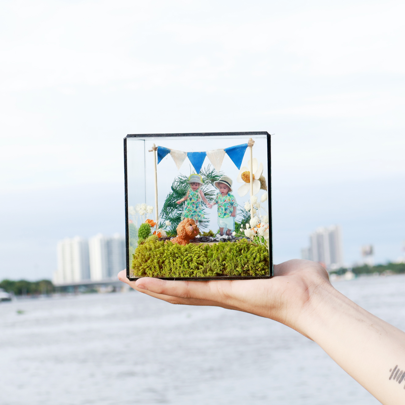 Tiểu cảnh "Lovely" là sự kết hợp hoàn hảo giữa nghệ thuật terrarium và việc lưu giữ kỷ niệm cá nhân. Đúng như tên gọi, sản phẩm mang đến một không gian rực rỡ, vui tươi với hình ảnh những người thân yêu cùng chung khung hình giữa một cánh đồng hoa cỏ rực rỡ.